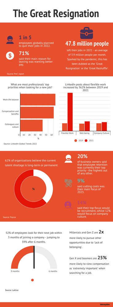 The rollout of the COVID-19 vaccination and the subsequent end of stringent lockdown measures triggered what has now been dubbed as ‘The Great Resignation’ - a period in which record numbers of employees left their jobs. In the US alone, an average of 4 million people left their jobs each month, while at the end of March 2022, job openings spiked to a record 11.5 million as the workforce boomed once more.