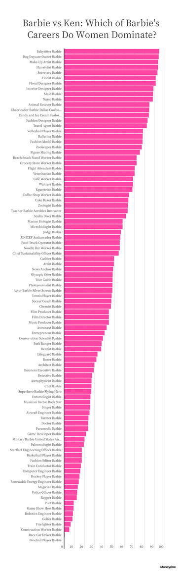 Out of the 95 careers we could find real-world statistical data on, Barbie (i.e. women) dominate just 39 of those fields. Of those careers, the one most dominated by women is childcare providers (Babysitter Barbie), with 94.3% of all individuals employed being women.