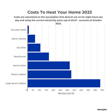 Likewise, smaller electric radiators (~600W) still drive up costs due to the current cost of electricity. A 600W electric heater left on for 8 hours a day would cost an average of £10.37 per day, translating to over £300 per month.