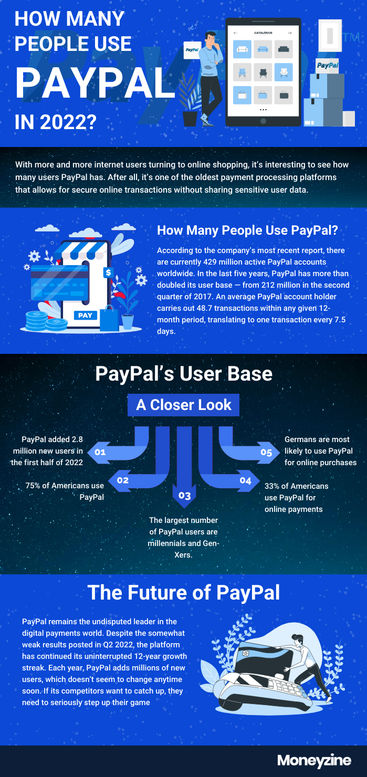 According to the company’s most recent report, there are currently 429 million active PayPal accounts worldwide. In the last five years, PayPal has more than doubled its user base — from 212 million in the second quarter of 2017. An average PayPal account holder carries out 48.7 transactions within any given 12-month period, translating to one transaction every 7.5 days.