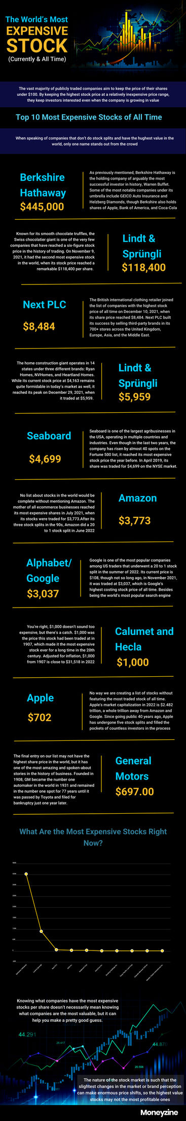 You’re right, $1,000 doesn’t sound too expensive, but there’s a catch. $1,000 was the price this stock had been traded at in 1907, which made it the most expensive stock ever for a long time in the 20th century. Adjusted for inflation, $1,000 from 1907 is close to $31,518 in 2022, placing the price of Calumet and Hecla’s stock just below the prices of Berkshire’s and Lindt’s shares. The same year, the company exceeded all expectations and was able to produce 100 million pounds of copper, which skyrocketed its stock price. Despite having one of the most valuable stocks of all time, Calumet and Hecla is no longer active today.