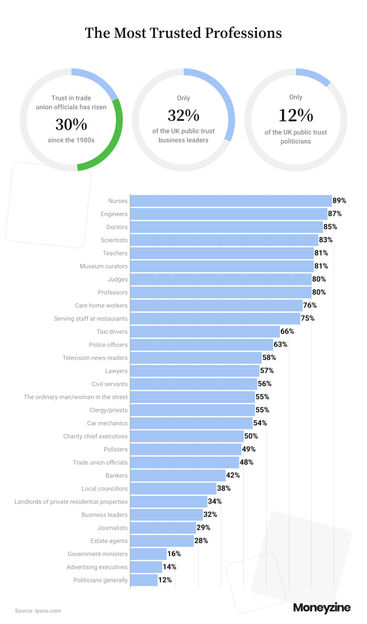 - Meanwhile only 32% of the UK public trust business leaders - and just 12% trust politicians.